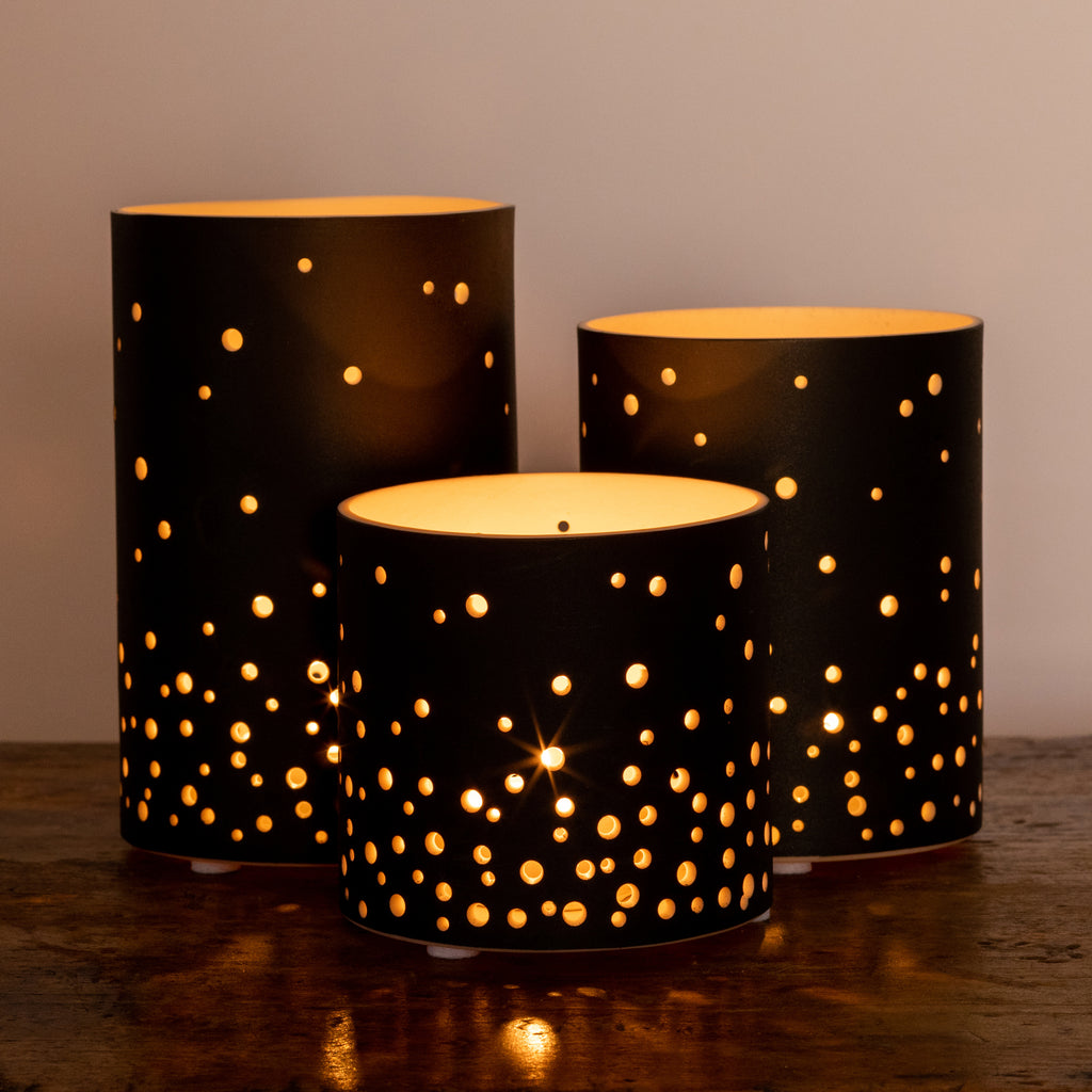 Dramatic and elegant, the Dark Star design is a twist on the original. Holes in the clay allow the light to sparkle through, mimicking stars in the night sky.